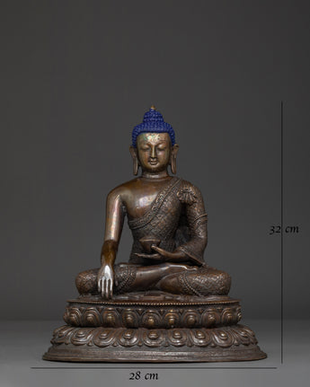 Experience the tranquil presence of the Shakyamuni Buddha Touching Earth Mudra, a stunning handcrafted statue depicting Buddha's enlightenment. This stunning artwork, made of oxidized copper, measures 32 cm tall and 28 cm wide, making it an eye-catching addition to any spiritual area. The earth-touching gesture (Bhumisparsha Mudra) represents the Buddha inviting the Earth to witness his enlightenment, expressing a profound spiritual message of triumph over illusion. Weighing 4.37 kg, this statue is an artistic masterpiece and a potent meditation focal point for practitioners seeking inner peace and change.