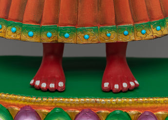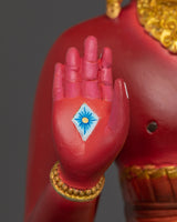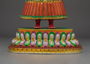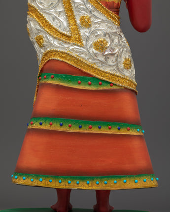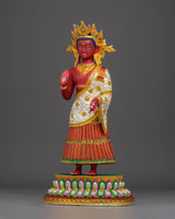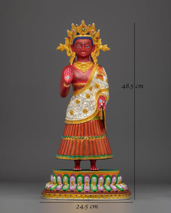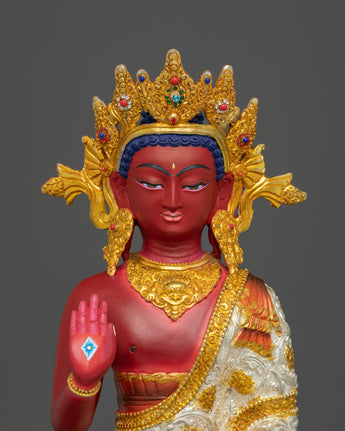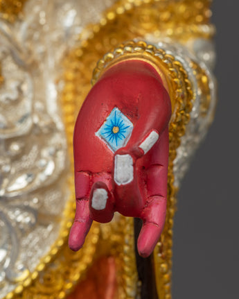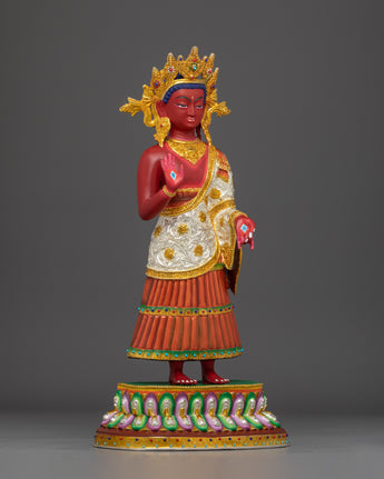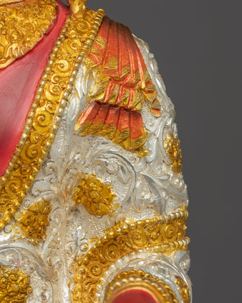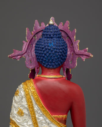 Experience the divine presence of the Shakyamuni Buddha with Crown Sculpture, a masterfully crafted piece measuring 48.5cm in height and 24.5cm in width. Weighing 5.33kg, this statue is made from copper, intricately finished with electro gold plating, electro silver plating, and hand-applied acrylic colors. The crown symbolizes enlightenment, wisdom, and spiritual authority, making this statue a powerful addition to your meditation space, shrine, or art collection.