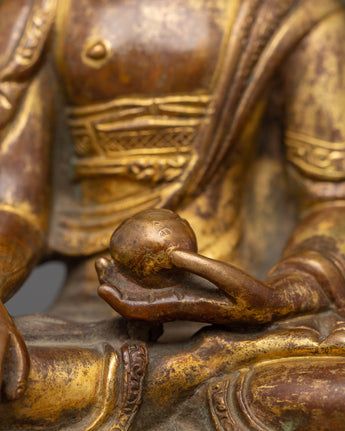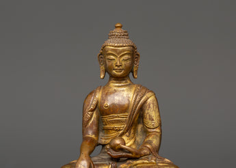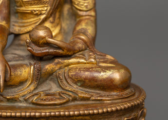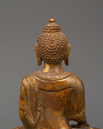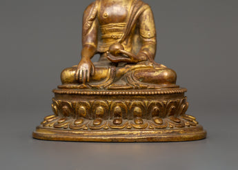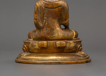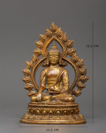 Standing 15.5 cm tall and 11.5 cm broad, this statue of Shakyamuni Buddha with Halo symbolizes the historical Buddha who became enlightened beneath the Bodhi tree. This statue, which is made of a copper body and exquisitely plated in gold, radiates a calm aura that is perfect for any religious environment. Shakyamuni's head is framed by an elaborate halo representing his awakened understanding and radiating compassion, which transmits light to all living things.