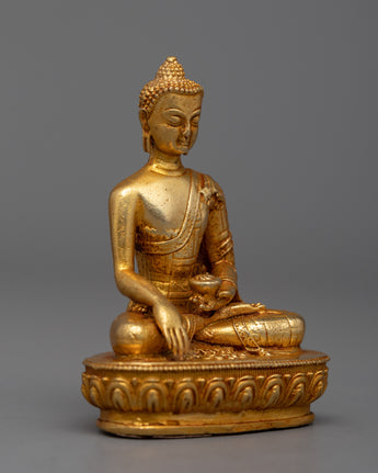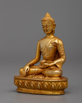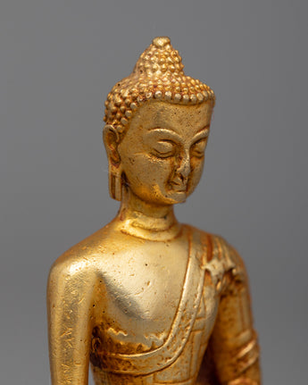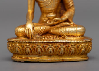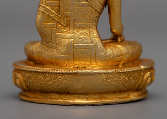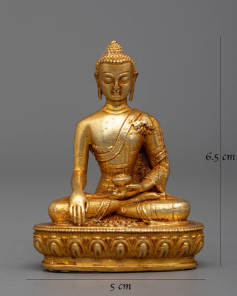 Standing about 6.5 cm tall, the Shakyamuni Machine Made Buddha Statue embodies the spirit of compassion and enlightenment. Exquisitely crafted from copper using sophisticated machine processes, it displays great craftsmanship and minute details. The statue, which is adorned with a brilliant layer of 24k gold plating and represents wisdom and purity, has a divine atmosphere.