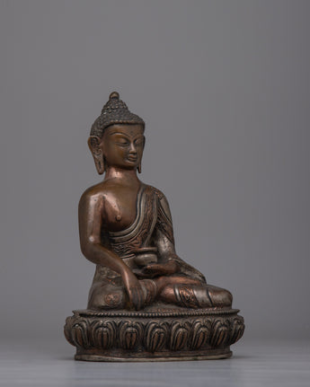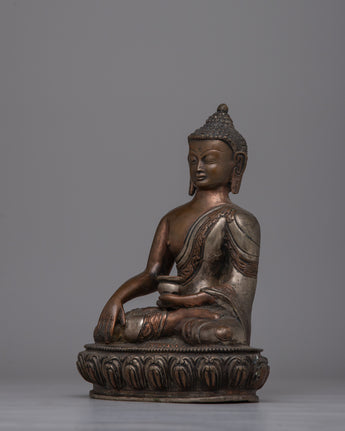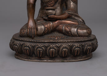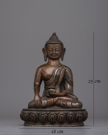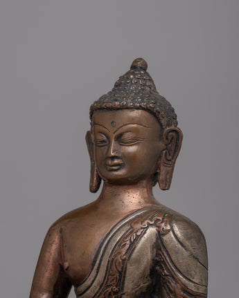 Presenting the Siddhartha Gautama Shakyamuni Statue, a skillfully made work of art that combines extraordinary creativity and profound spiritual importance. This statue is composed of brass and is 25 cm in height by 18 cm in breadth. It weighs a solid 2.80 kg. The historical figure of the Buddha, Siddhartha Gautama, is depicted in exquisite detail in a calm, peaceful pose that represents enlightenment, wisdom, and inner serenity.