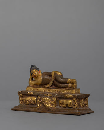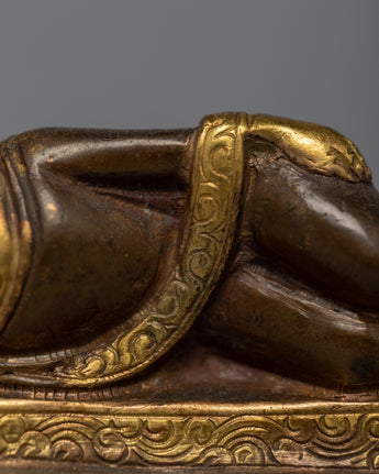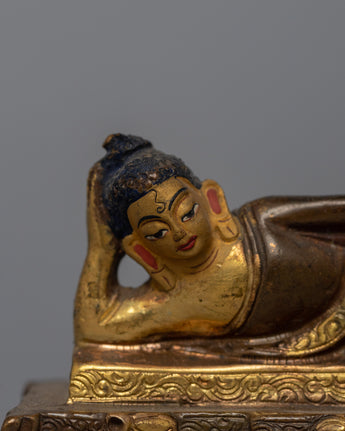 Introducing the serene Sleeping Buddha Statue, meticulously handcrafted on the copper body and adorned with delicate acrylic paint. This exquisite deity is depicted in a peaceful slumber, lying gracefully on a rectangular base. The intricate details and skilled artistry breathe life into the statue, capturing the essence of tranquility and inner peace that the Sleeping Buddha represents. The calming presence of this statue makes it a perfect addition to any meditation space or home altar, inviting a sense of serenity and mindfulness to those who behold it. Embrace the essence of rest and rejuvenation with this remarkable Sleeping Buddha Statue, an embodiment of tranquility and spiritual awakening.