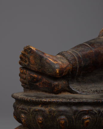 The Sleeping Buddha Statue, which has been carefully crafted with every detail in mind, emanates peace and spiritual elegance. Every curve and shape of the statue, which is handcrafted on an oxidized copper body, reveals the artisan's respect for the holy images of Buddhism. Every feature of the statue, from the calm expression on the Buddha's face to the soft robe folds, encourages reflection and thought.