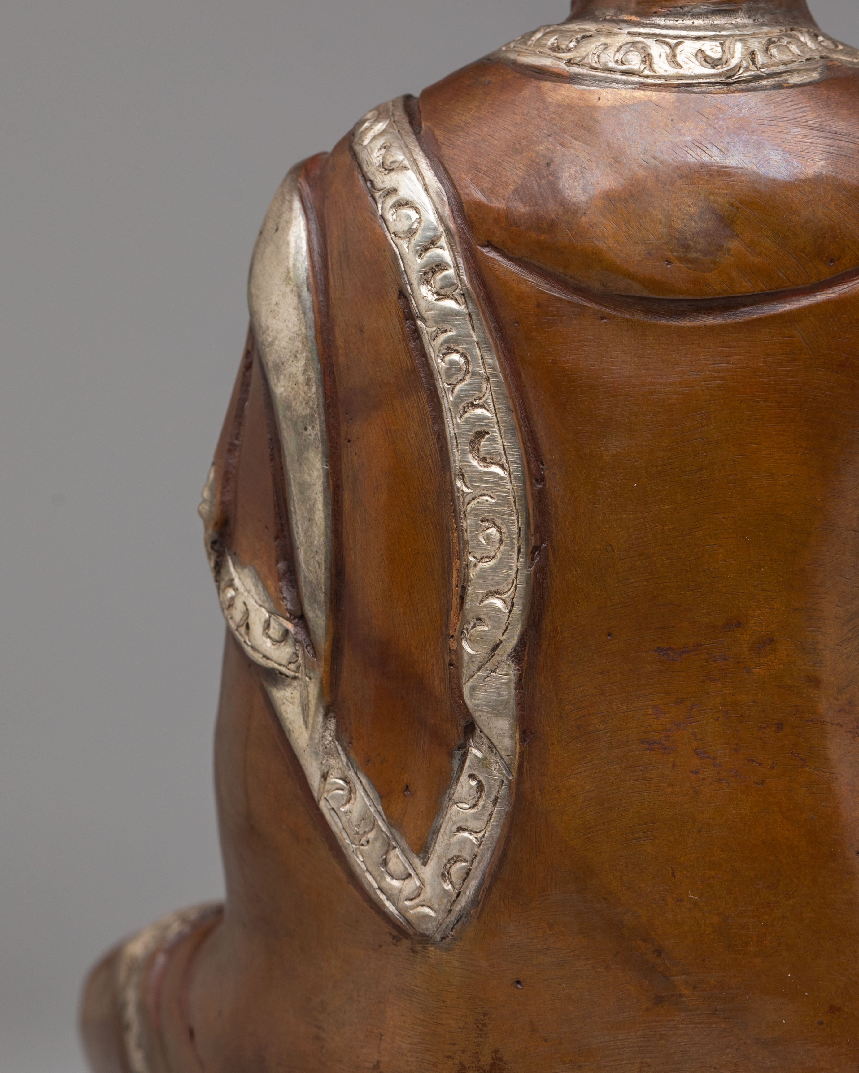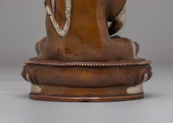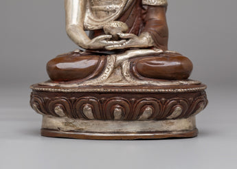 This exquisite handcrafted statue depicts Amitabha Buddha, known as the Buddha of Infinite Light and Compassion. Standing at 21.5cm tall and 14cm wide, it is crafted from oxidized copper and adorned with electro-silver plating, complemented by acrylic color detailing. The serene expression and intricate robes showcase the skillful craftsmanship of traditional artisans. This piece serves as a powerful symbol of peace, wisdom, and spiritual enlightenment, making it perfect for meditation spaces or altars.