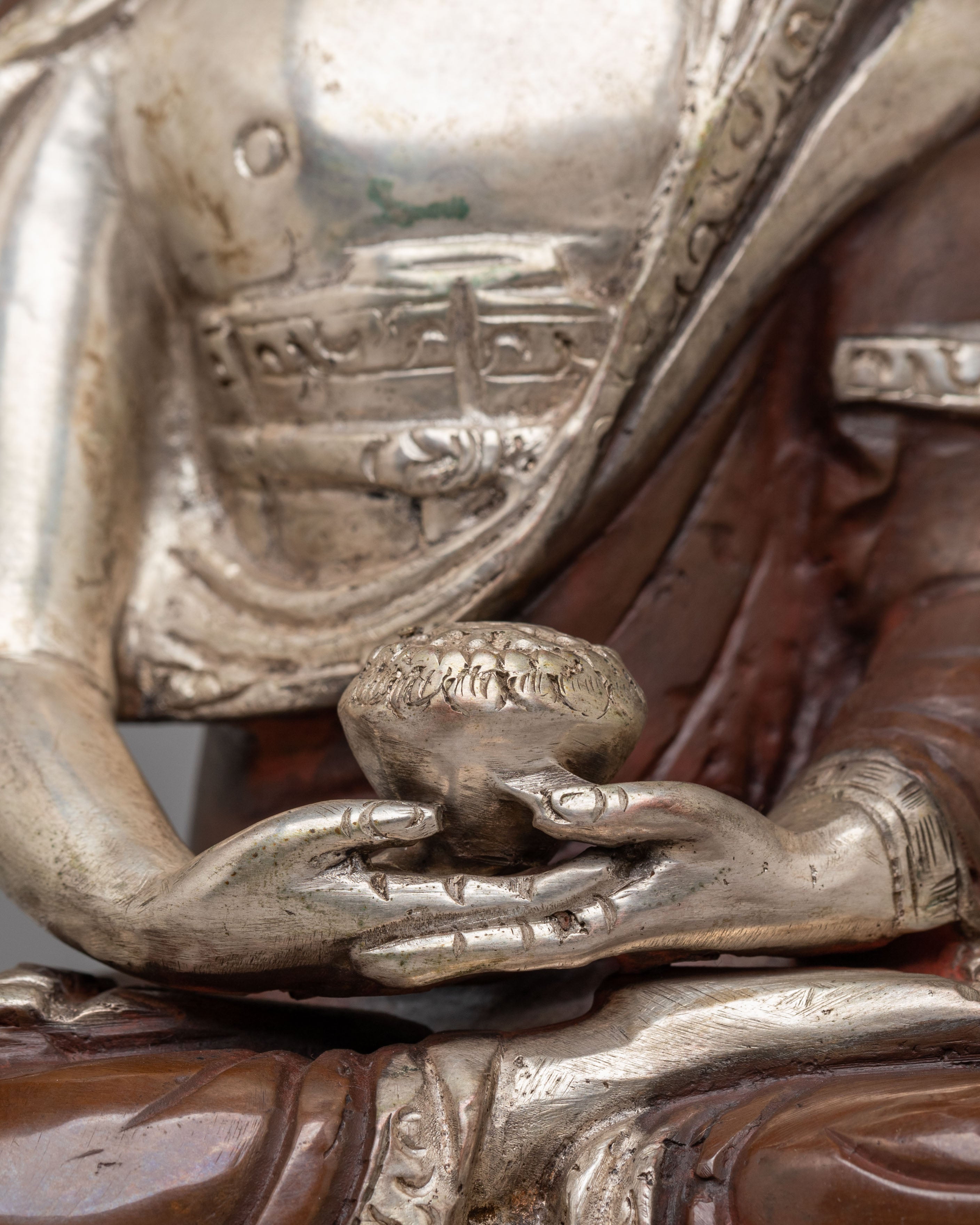 Amitabha is depicted in a tranquil seated pose, holding an alms bowl in his lap to symbolize renunciation and the simplicity of the enlightened life. His peaceful countenance represents the knowledge and compassion he bestows on individuals seeking rebirth in his Pure Land. Amitabha's dedication to helping all beings achieve spiritual awareness and freedom is demonstrated by this gesture.