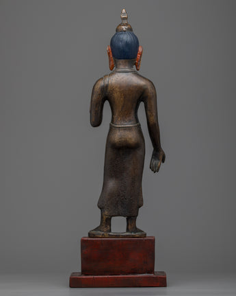 The Standing Shakyamuni Buddha figure has a relaxing air and spiritual solemnity. This monument exudes serenity as an embodiment of enlightenment and the teachings of the Middle Path. This masterpiece, meticulously crafted in Nepal, features an oxidized bronze body that contrasts brilliantly with the opulent 24k gold and colorful acrylic paintings, bringing to life the Buddha's elegance and wisdom.