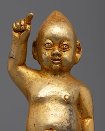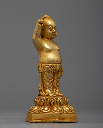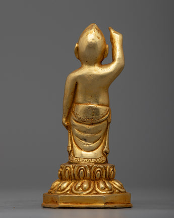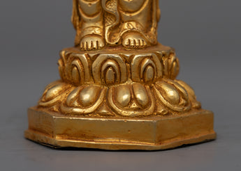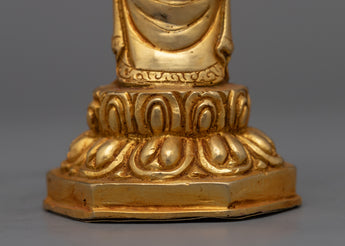 Presenting the Statue of Standing Buddha, a refined and tranquil depiction made of a copper body and beautifully plated in 24k gold. This 13-cm-tall machine-made statue depicts the Buddha in a standard standing position, signifying security, protection, and bravery. The Buddha's serene look and delicate outlines are accentuated by the gold plating, which emits a warm, golden glow that promotes calmness and introspection.