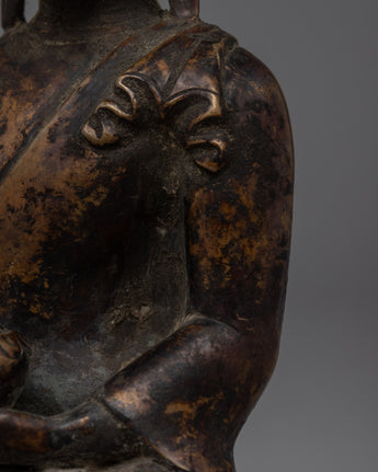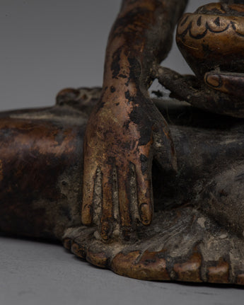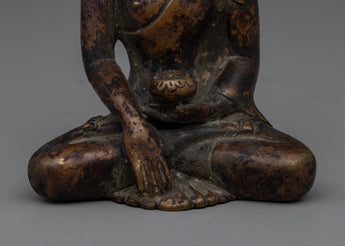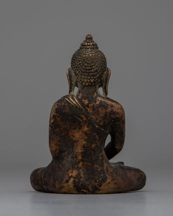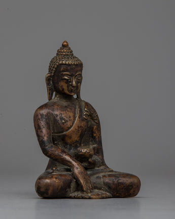 This Shakyamuni Buddha Statue, skillfully carved from oxidized copper with an antique finish, represents a profound connection to Buddhism's ancient teachings. Standing 11.5 cm tall, 8.5 cm broad, and weighing 0.760 kg, it depicts the Earth Touching Buddha's tranquil and powerful position. This classic gesture, known as "Calling the Earth to Witness," represents the Buddha's confession for the Earth to bear testimony to his enlightenment.