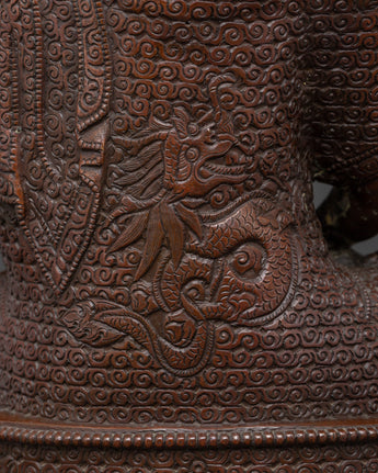 Elevate your spiritual environment with the Tibetan Amitabha Buddha Figurine, representing infinite light and compassion in Buddhism. This meticulously carved statue, 32 cm tall and 21 cm wide, depicts Amitabha Buddha in a meditation stance. Its corroded copper construction and polished, antique finish add to its religious aura. Amitabha, the Buddha of Boundless Light, is renowned for guiding souls to enlightenment and calm. This lovely figurine is ideal for meditation spaces, home altars, or as a centerpiece in a holy space, promoting a sense of calm and spiritual awakening.