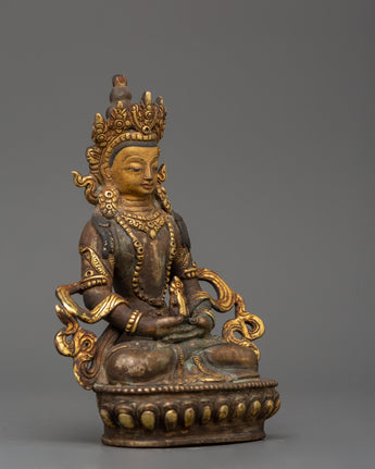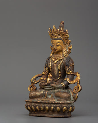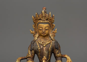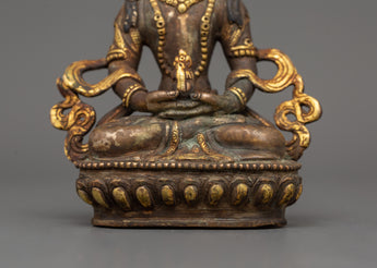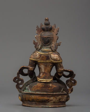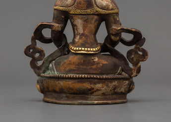 Amitayus, a deity adored in Mahayana and Vajrayana traditions, is associated with longevity, wisdom, and merit. Placing this deity in your sacred area invokes benefits for a long, healthy, and enlightened existence. The statue's antique patina reflects a timeless spiritual energy, making it both a strong spiritual object and a valuable piece of Himalayan art. This Amitayus sculpture is a dazzling emblem of boundless life and inner calm, whether utilized for daily meditation or devotional practice.