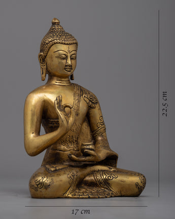 The exquisite Tibetan Amoghasiddhi Buddha Statue, handcrafted from brass, stands with a height of 22.5cm, radiating a sense of spiritual presence and artistic elegance. The intricate details and craftsmanship captured in this statue depict the serene countenance of Amoghasiddhi Buddha, embodying fearlessness and enlightenment. The use of brass adds a touch of warmth to the statue, highlighting the delicate features, ornate robes, and symbolic gestures that signify the Buddha's teachings. Whether as a spiritual centerpiece or a decorative element, this statue serves as a reminder of Amoghasiddhi's transformative wisdom and the profound teachings of Buddhism.