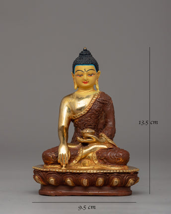 This handcrafted Tranquil Shakyamuni Buddha statue, 13.5cm tall and 9.5cm wide, represents enlightenment, wisdom, and inner serenity. It weighs 0.476 kg and is made of high-quality copper with a gold-plated finish and delicate acrylic detailing. It is ideal for altars, meditation rooms, and spiritual collections.
