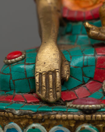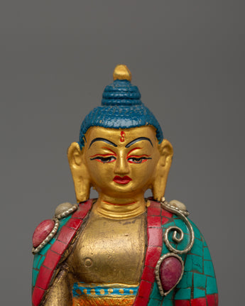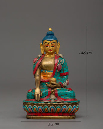 Handcrafted Tranquil Shakyamuni Buddha statue, a magnificent 14.5cm brass sculpture for meditation, spiritual practice, and altar decoration. Shakyamuni Buddha, also known as Gautama Buddha, was an enlightened teacher who taught the path to enlightenment and inner peace. This intricately constructed statue, with a 9.5cm base, is embellished with imitation turquoise and coral stones representing protection, knowledge, and peace.