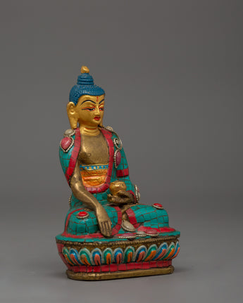 This magnificent Tibetan Buddha statue is made of high-quality brass and features meticulous craftsmanship that reflects traditional Himalayan artistry. Including turquoise and coral inlays heightens its spiritual importance, making it ideal for meditation rooms, altars, or as a thoughtful gift for spiritual seekers. Whether you are a Buddhist practitioner, a collector of sacred artifacts, or seeking serenity and enlightenment, this Shakyamuni Buddha figurine is a potent reminder to practice mindfulness and balance daily.