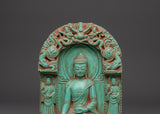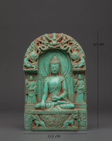 This magnificent Turquoise Shakyamuni Buddha statue is 20 cm tall and 13.5 cm broad, made of artificial stone with a brilliant green finish. The Buddha sits in the earth-touching mudrā on a finely carved throne, accompanied by two dedicated pupils. Above, a magnificent Garuda spreads its wings, representing protection and wisdom. Two guardian lions keep watch beneath the lotus throne, their ferocious presence counterbalanced by the Buddha's tranquil expression. The base features intricate vajra designs and swirling cloud patterns, showcasing traditional Himalayan craftsmanship. Every detail, from the folds of the robe to the students' focused look, has been lovingly hand-carved using centuries-old iconographic techniques.