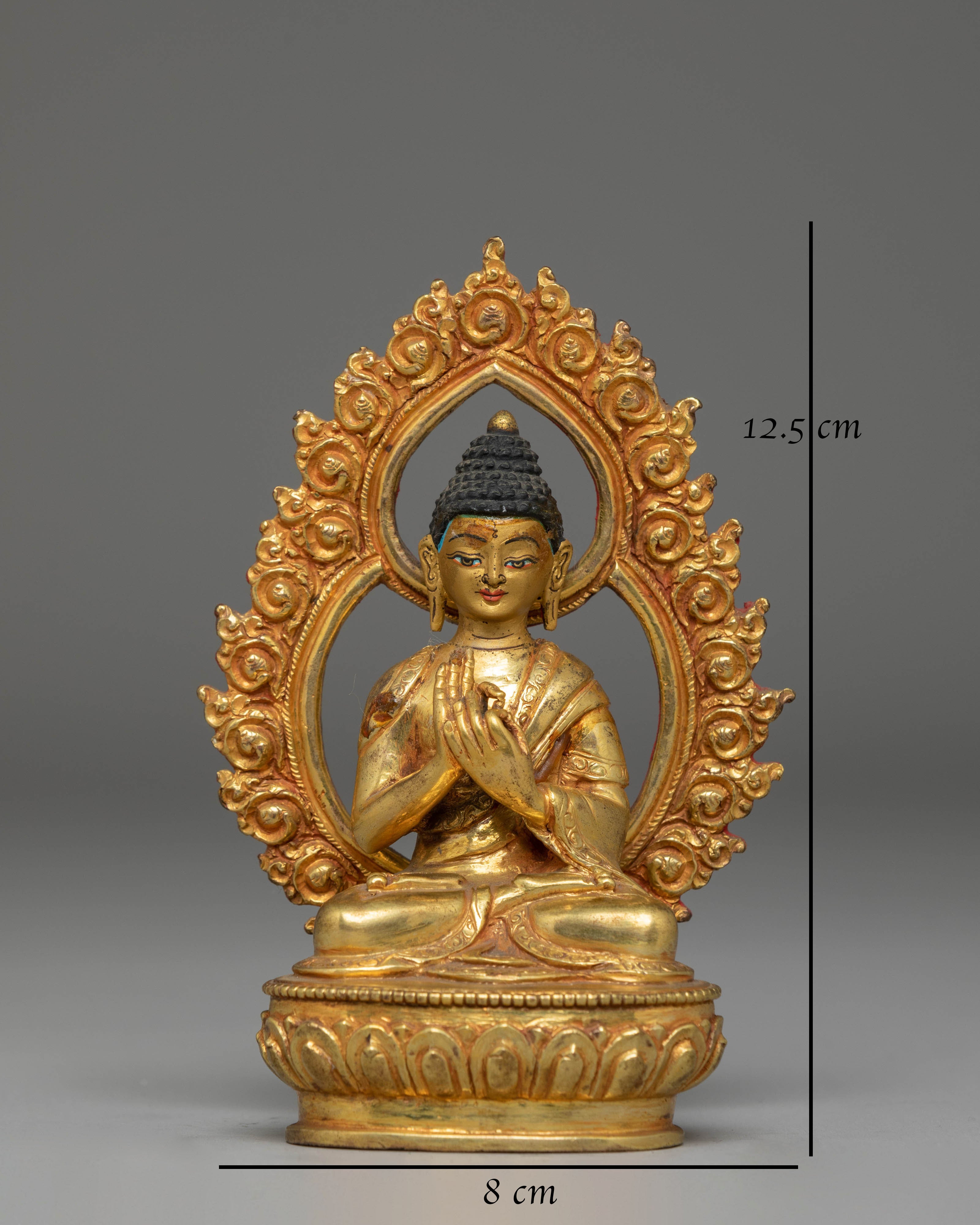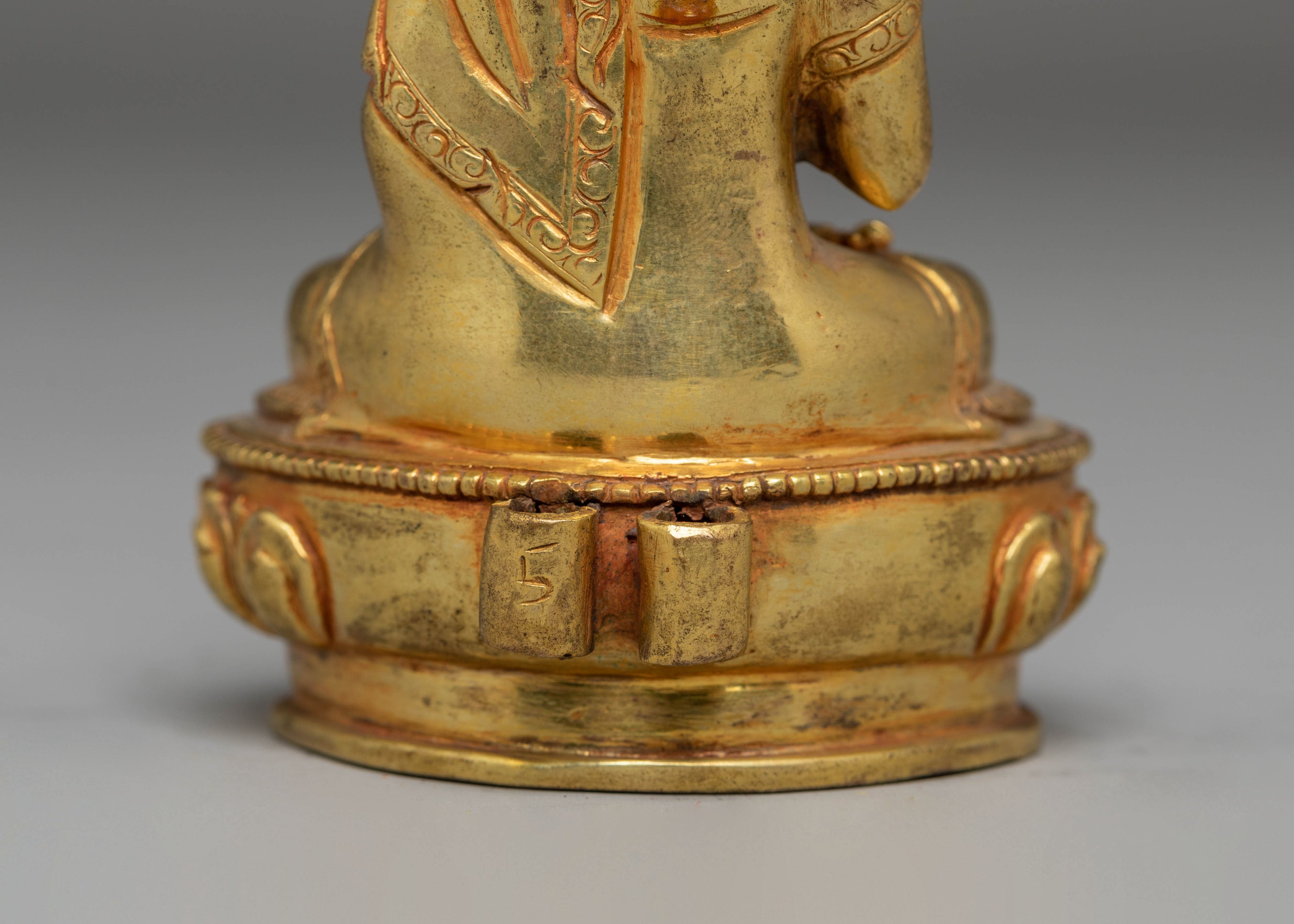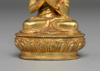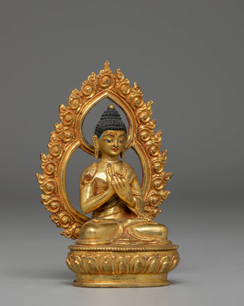 This Vairocana Buddha Handcrafted Statue is crafted from a copper body with a luminous gold-plated finish, measuring 12.5cm in height, 8cm in width, and weighing 0.32kg. Designed with exceptional attention to detail, it reflects the refined artistry found throughout Himalayan Buddhist traditions. Vairocana is revered as the source of enlightened understanding, making this piece a meaningful addition to spiritual settings or decorative collections.