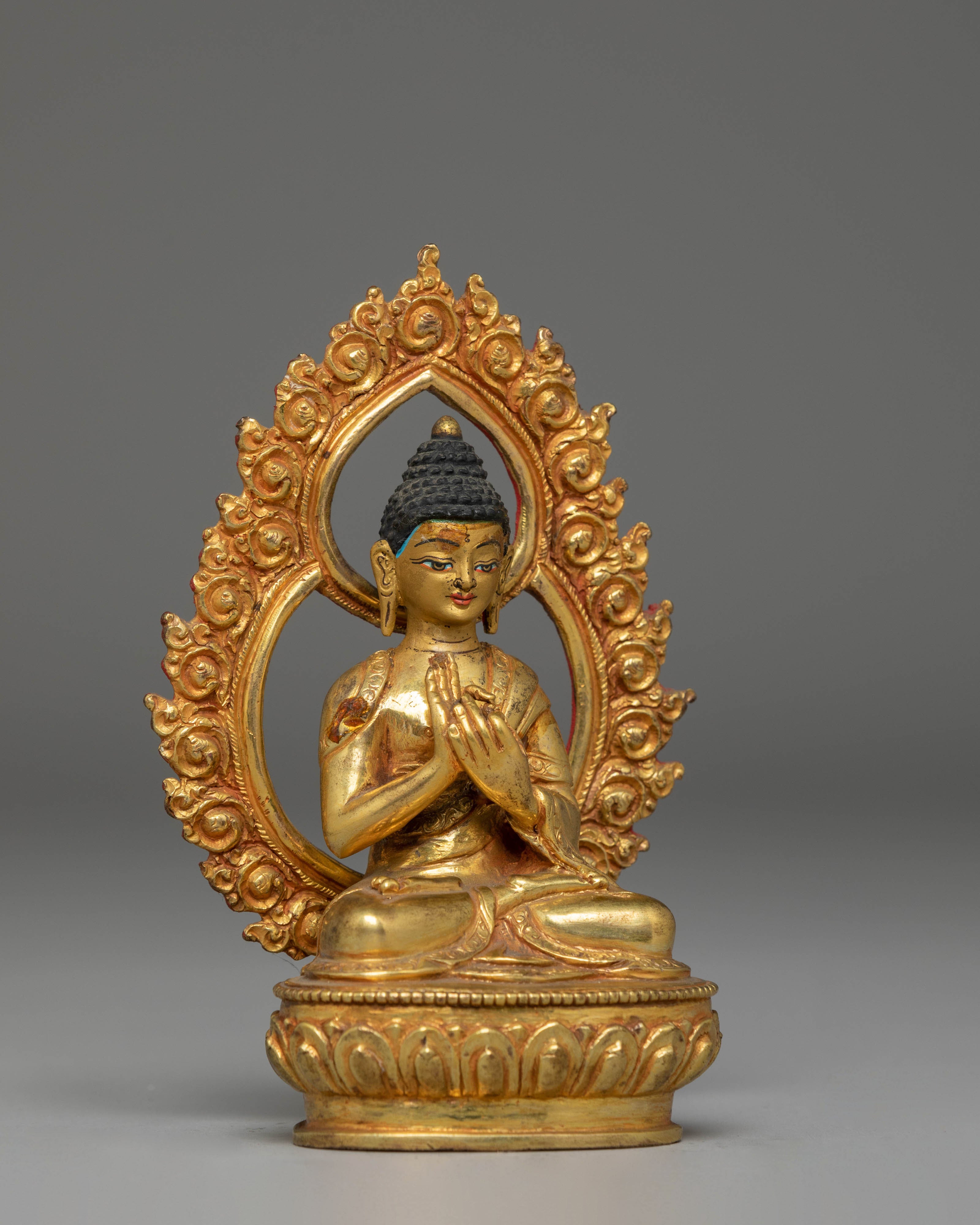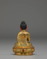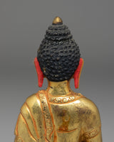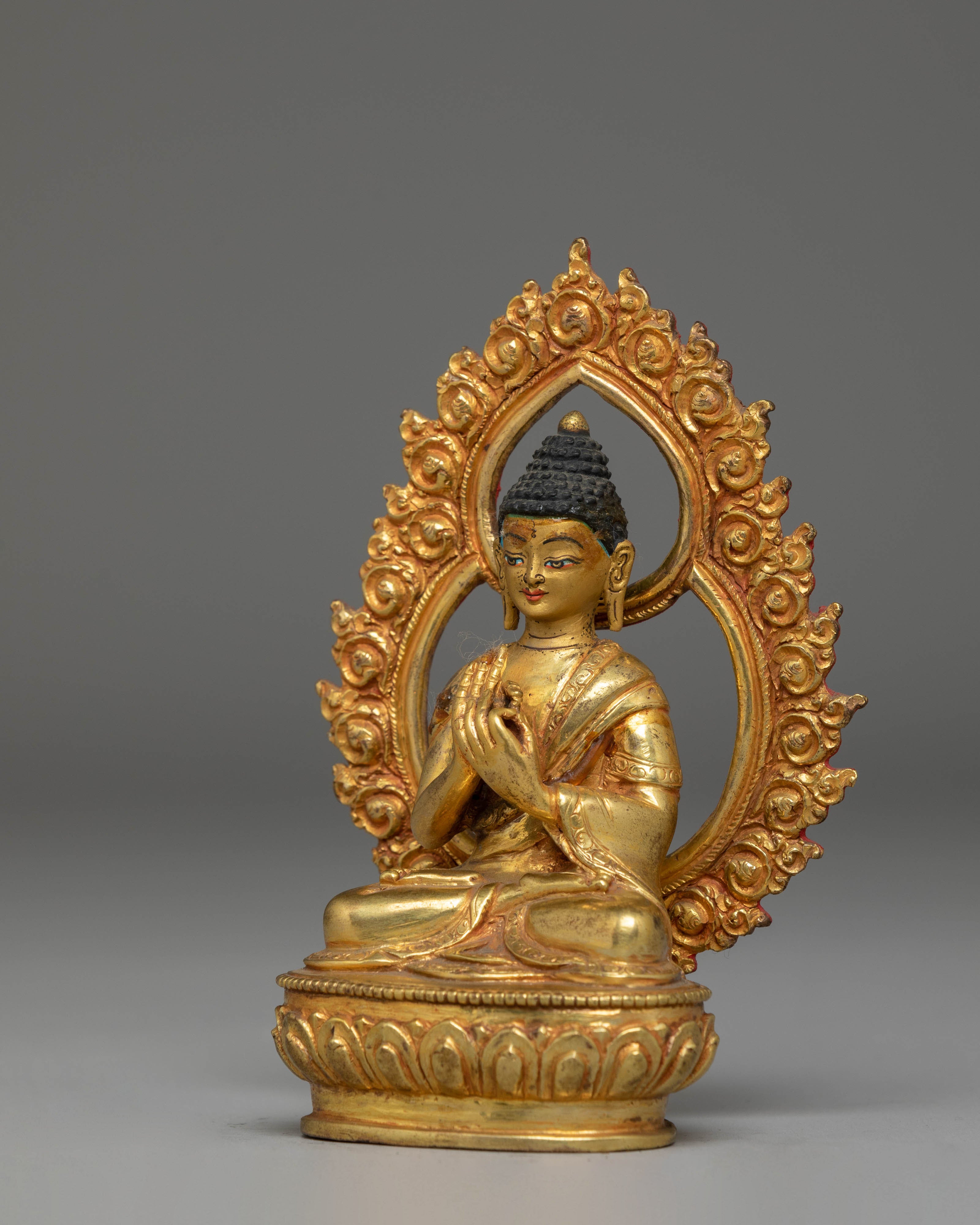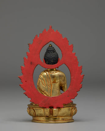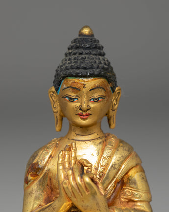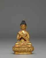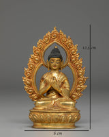 The statue showcases the Buddha seated in a composed posture, hands forming the gesture associated with imparting profound insight. The facial features are delicately painted, offering a gentle expression that invites calm and introspection. The decorative arch behind the figure is adorned with intricate motifs, each contributing to the sculpture's overall radiance and symbolic depth. Its gold-plated surface highlights the design's contours and soft lines.