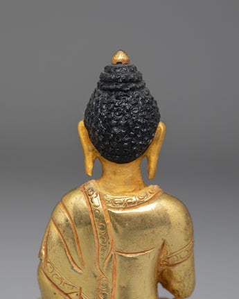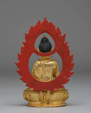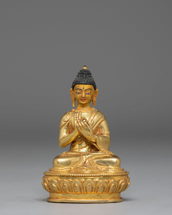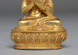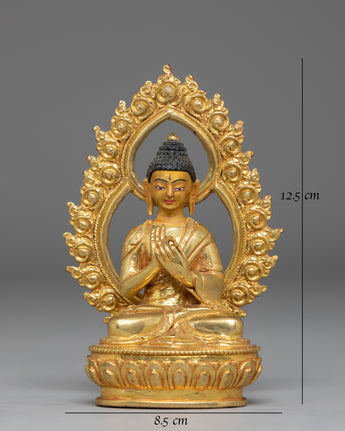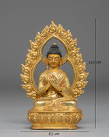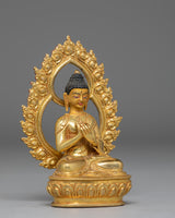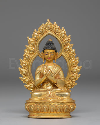 The statue features Vairocana seated in the dharmachakra mudra, symbolizing the turning of the Wheel of Dharma. The detailed facial expression, serene posture, and beautifully sculpted robes highlight the craftsmanship of traditional Himalayan metalwork. The ornate aureole surrounding the Buddha is adorned with layered motifs that evoke purity, radiance, and spiritual awakening. The gold-plated surface enhances the sculpture’s warm glow, making it a captivating centerpiece.
