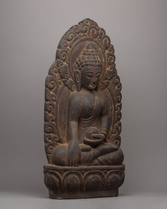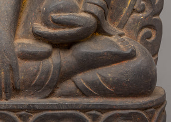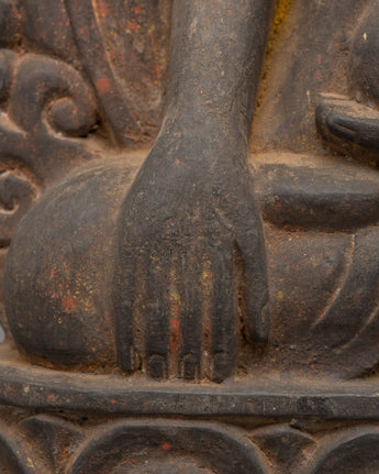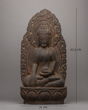 This wooden Shakyamuni Buddha statue symbolizes the teachings of the Buddha and is an exquisite representation of peace and enlightenment. This wonderfully carved statue, which measures 61.5 cm in height and 31 cm in breadth, shows Shakyamuni Buddha sitting in the earth-touching pose, signifying his enlightenment under the Bodhi tree. This graceful sculpture exudes spiritual calm and is ideal for altars, areas used for meditation, or as an attraction in any decoration.