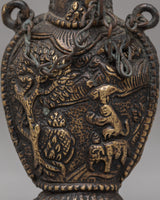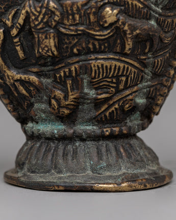 This handcrafted brass snuff pot is beautifully adorned with an antique finish and features the Four Harmonious Friends—a traditional Tibetan Buddhist symbol representing unity and friendship. Its delicate design showcases each animal's intricate detailing, with a Rabbit, monkey, bird, and elephant intricately carved around the pot, symbolizing harmony, balance, and cooperation. This unique snuff pot serves as both a functional piece and a meaningful decorative object for any home or sacred space, embodying the values of friendship and unity.