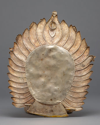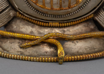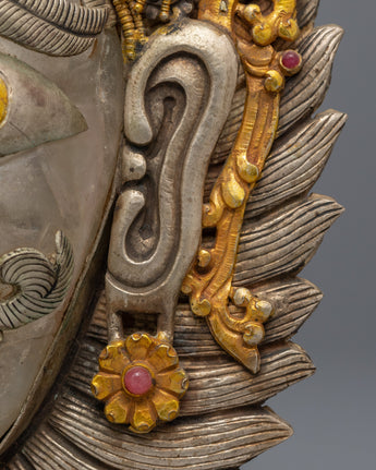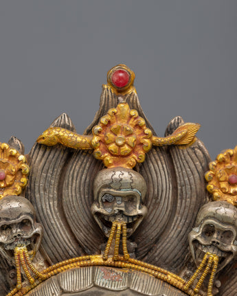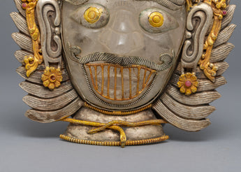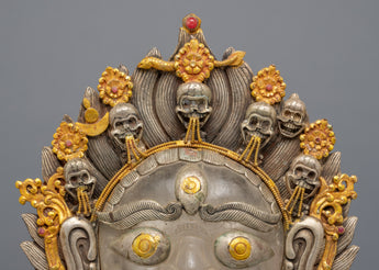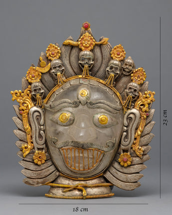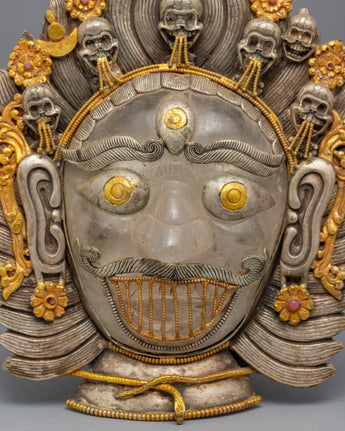 This Bhairav Crystal Face is a handcrafted copper body with 24K gold and silver plating. The red turquoise stone is placed at the top. The ornaments of the bhairav are gold plated, while the skull crown is silver plated. The hair is silver plating, which makes the outer part of the face very beautiful.