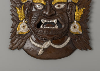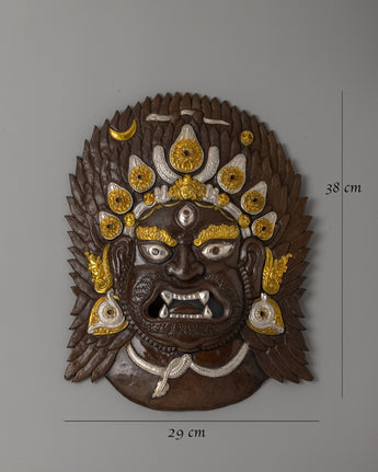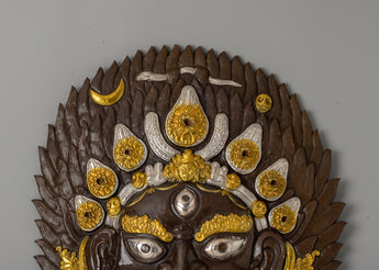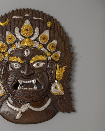 This Bhairav mask is a striking and intricate piece crafted from oxidized copper with gold and silver plating. It features a five-jewel crown adorned with skull carvings, reflecting Bhairav’s wrathful nature. At the center of the crown, the head of a deity wrapped in a snake enhances the mask's intense energy. The fierce eyes and open mouth emphasize the mask's commanding presence, adding to its powerful expression.
