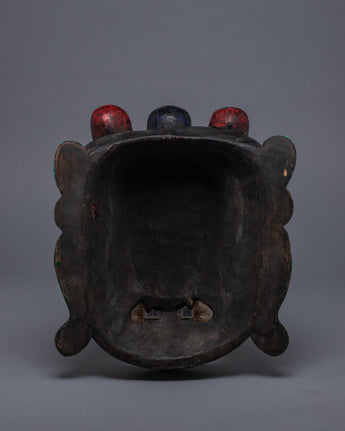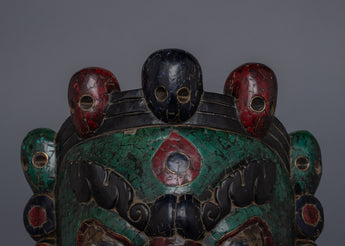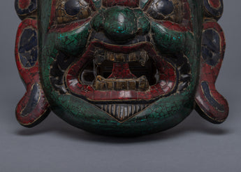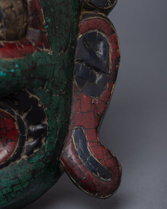 The Wooden Bhairva Mask with Gemstones is a magnificent depiction of the powerful Hindu deity Bhairva. Bhairva's face has a fierce expression, complete with prominent fangs and bulging eyes, capturing his aggressive and unyielding nature. The mask is made of wood, which gives it a warm and natural feel, and Gemstones are used to highlight the intricate details of the design. Precious gemstones add a touch of elegance and beauty to this piece, making it a true work of art.