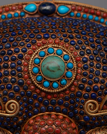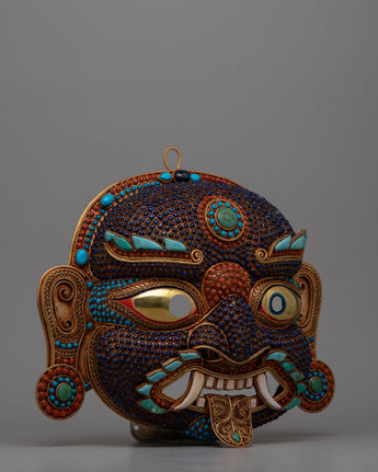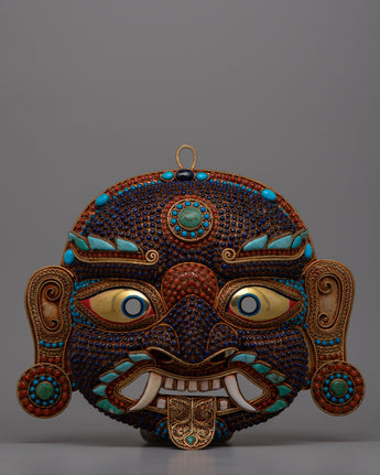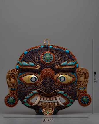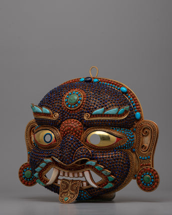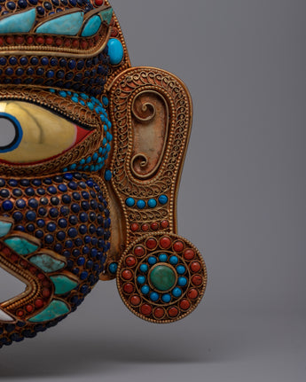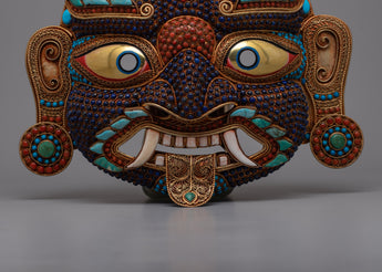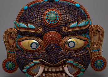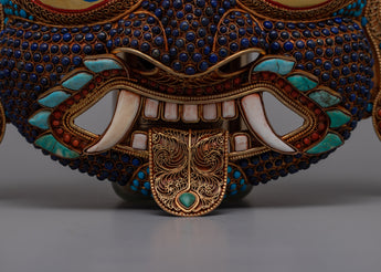 Savor the breathtaking beauty of the Copper Lakhe Mask, which is a masterpiece of handmade artistry that is meticulously made on a copper body. With its electro-gold plated finish, this premium mask radiates grandeur and makes a statement in any situation. The authentic coral, turquoise, lapis lazuli, and conch shell that have been carefully inlaid to enhance both the piece's aesthetic appeal and cultural value are what make it stand out.