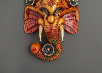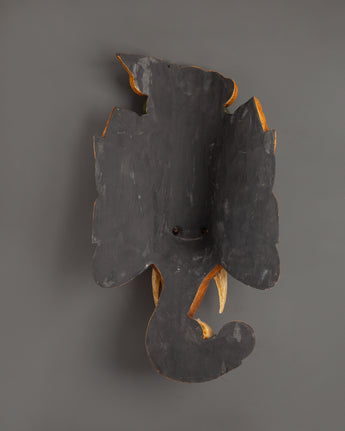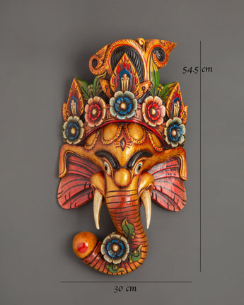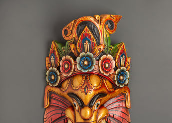 The elaborate floral crown, elaborate patterns, and bright colors for protection, prosperity, and wealth represent Ganesh's divine spirit. This mask is both a decorative and spiritual statement piece due to the exceptional artistic touch added by the exquisitely curved trunk embellished with flower designs. This handcrafted Ganesh mask symbolizes the rich tradition of Himalayan workmanship and spiritual symbolism, whether utilized for religious purposes, cultural appreciation, or as an artistic focal point.