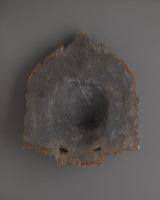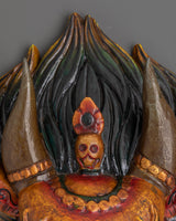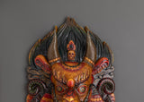 This Tibetan wooden Garuda mask is a colorful representation of traditional Himalayan workmanship. Each mask is hand-painted in vibrant, symbolic colors to represent Garuda's fiery temperament and celestial protection. Garuda, with furious eyes, outstretched wings, and a crown of flames, is frequently invoked in Buddhist rituals to remove impediments and protect against negative energies. Hanging this mask on a wall is thought to provide a protective barrier while also increasing the spiritual energy of any location, making it great for altars, prayer rooms, or sacred corners of your home.