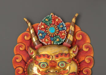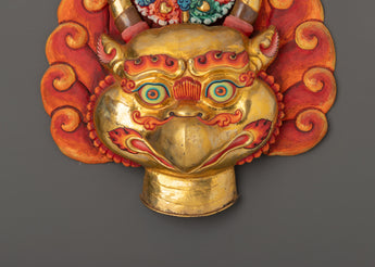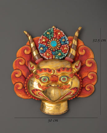 Garuda is known as a fierce defender against negativity, recognized for his ability to repel evil and protect spiritual practitioners. The flame-like aura surrounding the mask represents divine strength, while the detailed craftsmanship on the eyes and beak signifies intelligence and alertness. In Buddhist traditions, Garuda is acknowledged for removing illusion and ignorance; thus, this gold-plated Garuda wall hanging would make an auspicious addition to any home, temple, or meditation space.