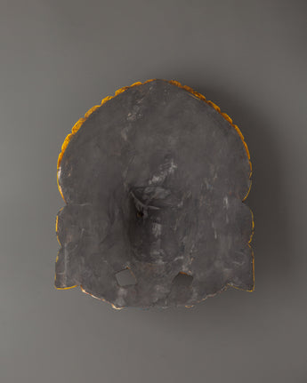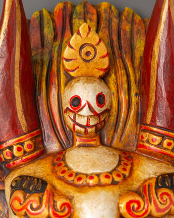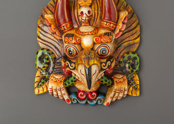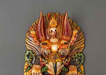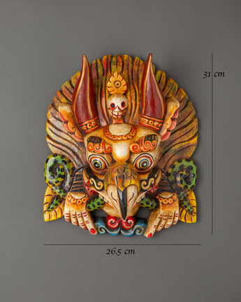 Beautifully represented in this handcrafted wall hanging, the Garuda is a bird god revered in Buddhist and Hindu cultures as a protector against evil and negativity. This mask is 31 cm in height and 26.5 cm in breadth. It is carefully hand-painted with acrylic colors, carved from wood, and is perfect for home altars, meditation areas, or religious décor.