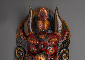 This mask is a striking example of Himalayan ritual art, likely inspired by Tibetan or Nepalese traditions. It is carved from wood and painted in vivid colors, dominated by deep reds, glossy blacks, shimmering golds, and rich greens. The craftsmanship is highly detailed, with each curve and contour carefully accentuated by painted highlights. The overall form conveys intensity and power, intended to both captivate and intimidate the viewer.