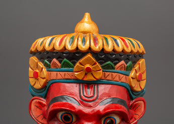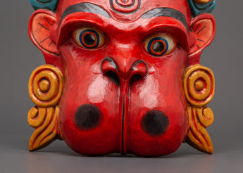 Hanuman, the monkey god and passionate devotee of Lord Rama represents strength, devotion, courage, and selfless service in Hindu mythology. The flaming red face symbolizes his undying determination and heavenly strength, while his wide, alert eyes reflect eternal alertness and intelligence. The magnificent crown, decorated with floral designs and gold accents, represents divine blessings and spiritual enlightenment. The enlarged ears and detailed workmanship symbolize his capacity to listen to believers' prayers and eliminate impediments.