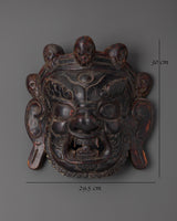 Expertly constructed from wood and painted with acrylic colors, this piece features delicate carvings, such as the skull cap, which represents the cycle of life, death, and rebirth. The dark tones with slight red highlights underline its vigorous intensity, while the exquisite etchings add to its spiritual symbolism. This stunning creativity transforms it into not just a sacred ceremonial mask, but also a beautiful piece of traditional Tibetan décor. This Tibetan Buddhist Kala Bhairava mask is both a gorgeous artwork and a spiritual talisman. It embodies the power of wrathful compassion, which is said to remove impediments, defend holy locations, and give practitioners strength.