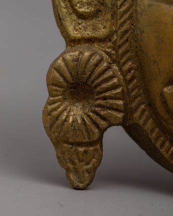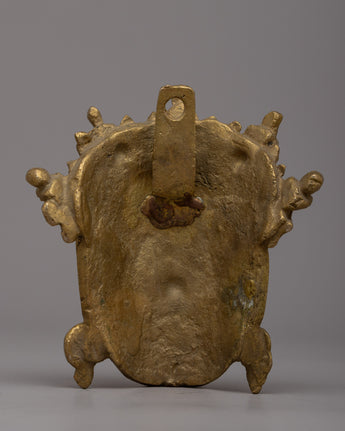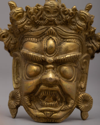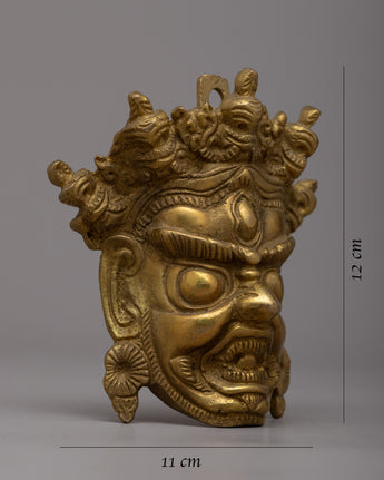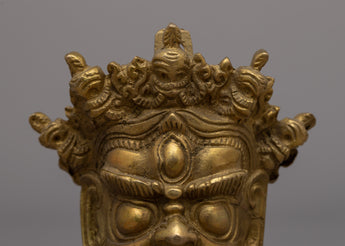 The Brass Mahakala Head is a masterful creation meticulously handcrafted from brass, capturing the fierce countenance and divine presence of Mahakala, a powerful protector deity in Tibetan Buddhism. With intricate attention to detail, the front face of Mahakala is skillfully crafted, conveying his wrathful and awe-inspiring nature. The use of brass as the medium adds a touch of regal elegance to the piece, enhancing the overall aura of spiritual significance.
