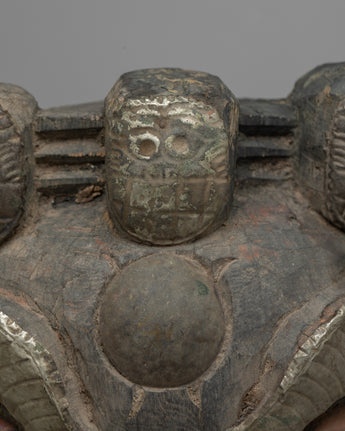Enter the realm of authenticity with our Mahakala Mask, a true representation of ancient power that stands 35cm tall and is delicately carved on wood. This vintage Mask was collected during 1980's from Kathmandu brought down from Himalayan region for barter and trade.