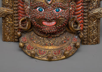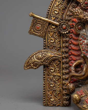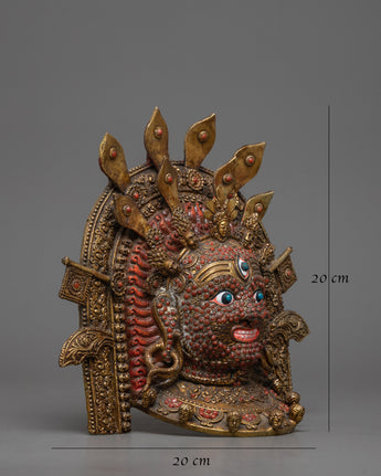 The Buddhist Mahakala Mask Wall Hanging represents the fierce protector deity Mahakala of Tibetan Buddhism. It is expertly handcrafted from brass and embellished with 24k gold plating. Mahakala's formidable essence is captured in this wall hanging with its divine gold sheen, which draws attention to his powerful visage and minute details, signifying spiritual strength and protection.