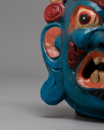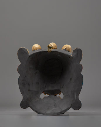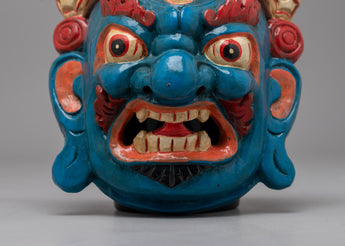 The wooden mask's intricate design conveys Mahakala's heavenly strength and presence. Every component of the mask, from the oversized features to the vivid colors and elaborate patterns, adds to its capacity to inspire awe and veneration. The Wooden Mask of Mahakala is a powerful reminder of the protective powers contained by this respected deity, encouraging followers to develop courage, wisdom, and compassion in their spiritual journeys whether it is used in ritual ceremonies or displayed in a holy area.