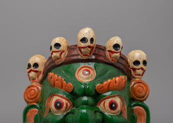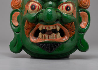The Nepal Mahakala Mask is evidence of the country's rich spiritual and cultural traditions. This mask, which is made by hand from wood and has elaborate acrylic painting on it, represents the strong and protective force of Mahakala, a goddess that is highly adored in Tibetan Buddhism. With its oversized features and striking hues that represent Mahakala's position as a protector against evil forces and impediments, the mask, standing at a height of 21 cm, perfectly conveys the sense of his frightening presence.
