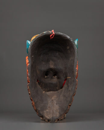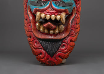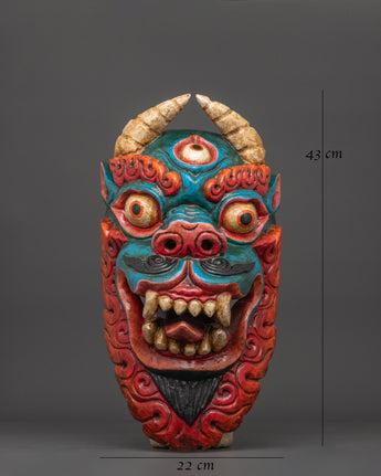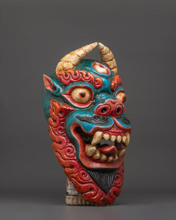 This Snow Lion Mask Wall Art Decor stands 43 cm tall and 22 cm wide, elegantly carved from wood and enhanced with vibrant acrylic colors. The Snow Lion, a cherished icon in Tibetan Buddhism, symbolizes power, protection, and bravery, making this sculpture a perfect addition to any setting aimed at inspiring these qualities. With its intense expression, this mask functions as a spiritual emblem and a captivating ornament.