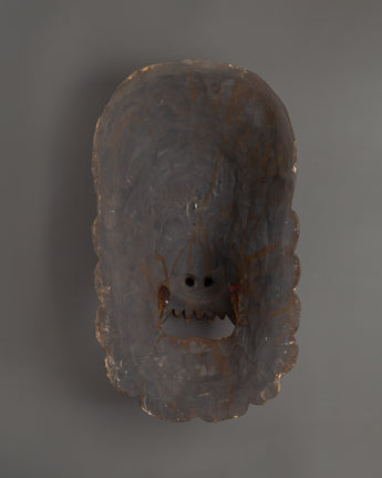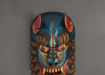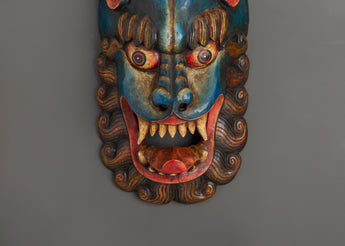 The fierce face, sharp teeth, and striking blue hues of the Snow Lion represent heavenly power and fierce defense. According to Tibetan legend, Manjushri, the Bodhisattva of Wisdom, who symbolizes the limitless energy of the enlightened mind, travels in the Snow Lion. This mask is an encouraging representation of spiritual rebirth and a potent defense against negativity. This handcrafted Tibetan mask is a meaningful and distinctive addition to any environment, whether utilized for ceremonial purposes, cultural appreciation, or as an eye-catching focal piece.