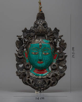 Presenting our 21.5cm-tall Tara Face Mask Wall Hanging, which is painstakingly crafted from ceramic and features inlays of coral and turquoise. The divine energy of Tara, a revered figure in Tibetan Buddhism that represents compassion and enlightenment, is embodied in this exquisite piece.
