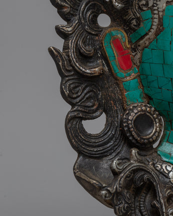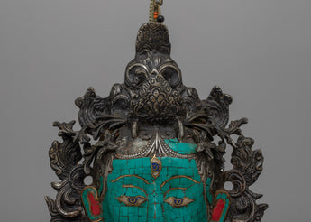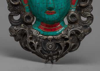 Each element of this mask, which was painstakingly crafted, captures Tara's grace and wisdom. The intricate inlays of coral and turquoise, which give the piece vibrancy and spiritual significance, are supported by a sturdy ceramic base.