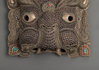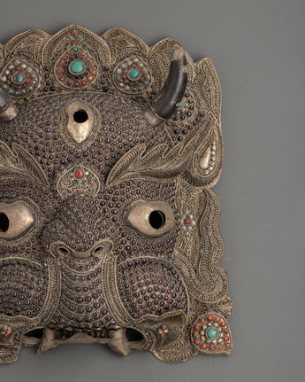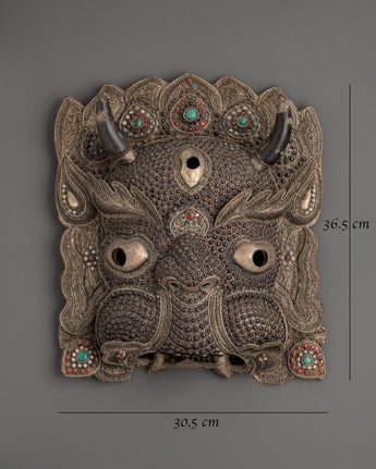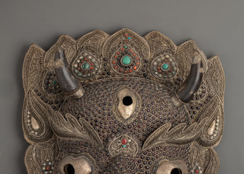 This elegant filigree mask is expertly fashioned of high-quality copper and has delicate handwork and symbolic decoration. The artificial turquoise stones inlaid in the pattern strengthen the mask's protective aura, which is thought to fight against negativity and provide blessings. Whether displayed as a striking wall piece or set on a Buddhist altar, this three-eyed Tibetan mask embodies spiritual depth and creative brilliance, making it excellent for collectors, spiritual practitioners, and those interested in Himalayan culture.