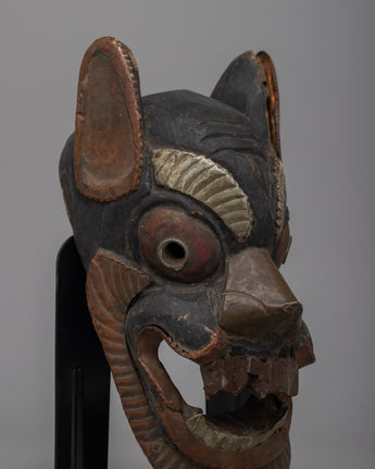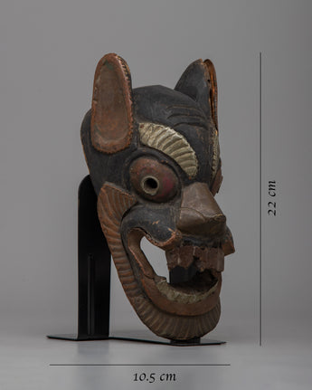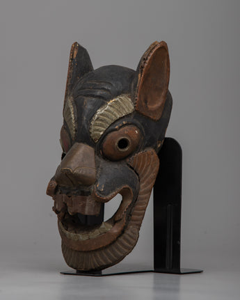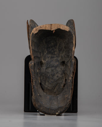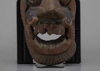 The Tibetan Barong Mask, a beautiful measuring 26 cm tall, is a captivating work of art that exemplifies the Himalayan region's cultural richness. Handcrafted from wood, this vintage mask represents the mythical Barong, a respected figure in Tibetan folklore famed for its protective and auspicious properties.
