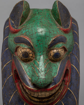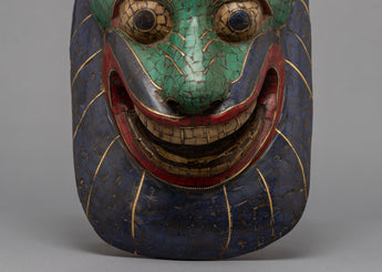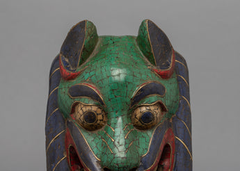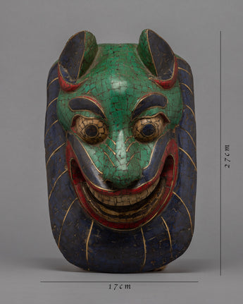 This Tibetan mask is a true masterpiece of craftsmanship, made by skilled artisans who have carefully handcrafted it with intricate designs and gemstones embedded in it. Each gemstone is precisely placed, adding to the mask's beauty and value. The mask is not only an aesthetically pleasing work of art but also a cultural symbol that represents traditional practices and beliefs. It is a perfect addition to any art collector's collection or can be displayed in any space to add a touch of elegance and style.