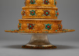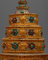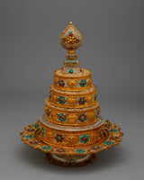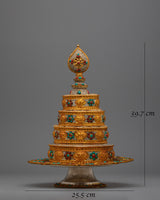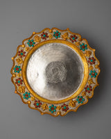 Offering the Buddhist Mandala Set, an exquisitely assembled artwork that masterfully captures the rich spiritual legacy and sophisticated creativity of Tibetan handicrafts. This excellent set is enhanced both visually and spiritually by the addition of artificial turquoise and Panna and is made from copper body embellished with electro-gold plating. This mandala set, which weighs 1.446 kg and measures 39.7 cm in height by 25.5 cm in width, is a powerful depiction of the cosmos and the spiritual path in Tibetan Buddhism.