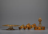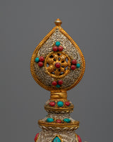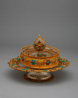 This mandala set is more than just a beautiful item; it's a significant artifact that represents fine craftsmanship and profound beliefs. The spirit of traditional Tibetan art is captured by the use of copper with electro-gold plating, which ensures longevity and a timeless appearance. The Buddhist Mandala Set offers both artistic quality and spiritual enrichment, with each element skillfully made to reflect its spiritual virtues. It is a priceless addition to any collection or hallowed space, serving as a monument to the rich spiritual and creative traditions of Tibetan Buddhism.