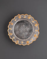 This handcrafted Tibetan Mandala Offering Set is a magnificent ritual object utilized in Vajrayana Buddhism. This sacred relic, measuring 38 cm in height and 26 cm in width, is skillfully crafted from copper and plated with gold and silver. The central offering mandala plate, measuring 16 cm in width, is intended for the ritual presentation of the universe to enlightened beings, representing the practitioner's offering of body, speech, and mind.